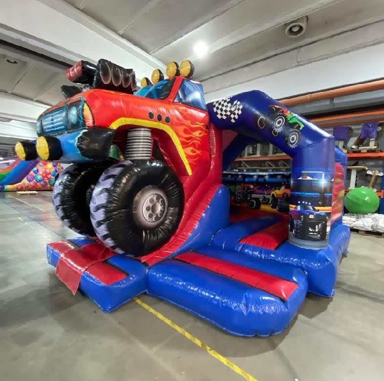 Bring big-roar fun to your party with the 12ft x 15ft Monster Truck Red/Blue (34). 🚚 Bright red and blue, a bold 3D monster truck slide and printed pillars make this monster truck bouncy castle a show-stopper. Safe design with a stitched raincover keeps little climbers inside. Ideal for boys birthday parties, toddlers and younger kids who love trucks. 🎉